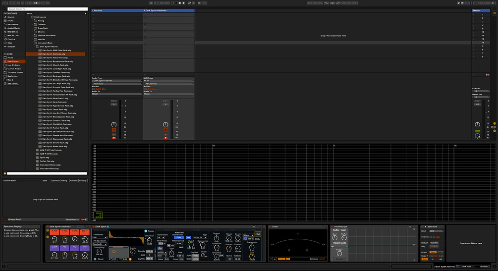 A collection of 26 custom-made Instrument Racks containing Amazing Noise's Dark Synth for Ableton/Max4Live. Each preset takes full-advantage of Dark Synth's features. Dark Synth offers-up Additive, Subtractive and Waveform/Wavetable synthesis in an easy to use interface. It is an inspiring instrument. These patches range from heavy, evolving pads, strange organs, spaced-out string instruments, deep, evocative bass patches, digital grit, organic percussive sounds and soundscape generators. These patches are made to be tweaked. Each preset is optimized for maximum sound quality. Instead of doing 50 smaller presets I decided to dig deep into Dark Synth and pull out its guts with quite a bit of programming in each patch.